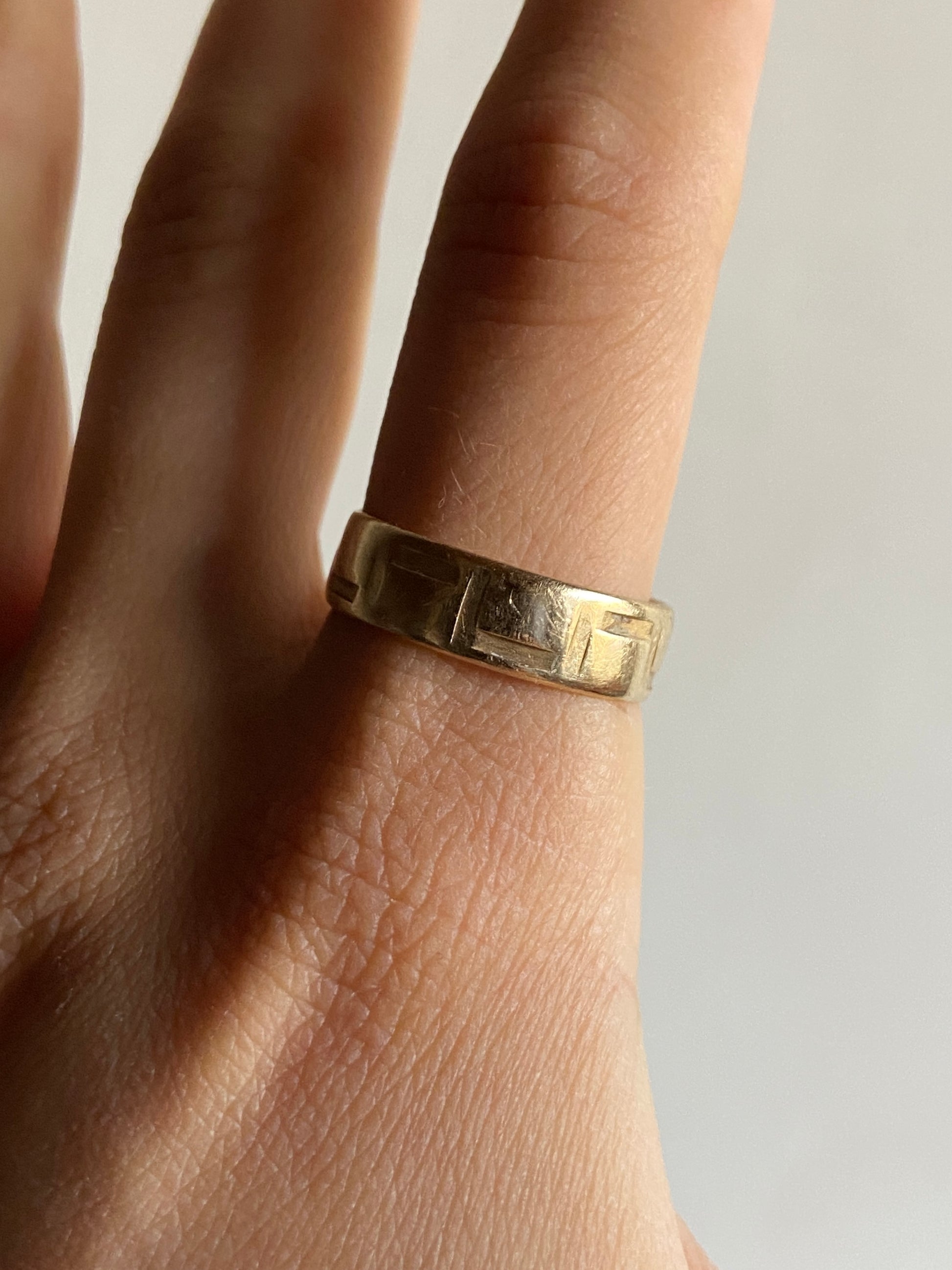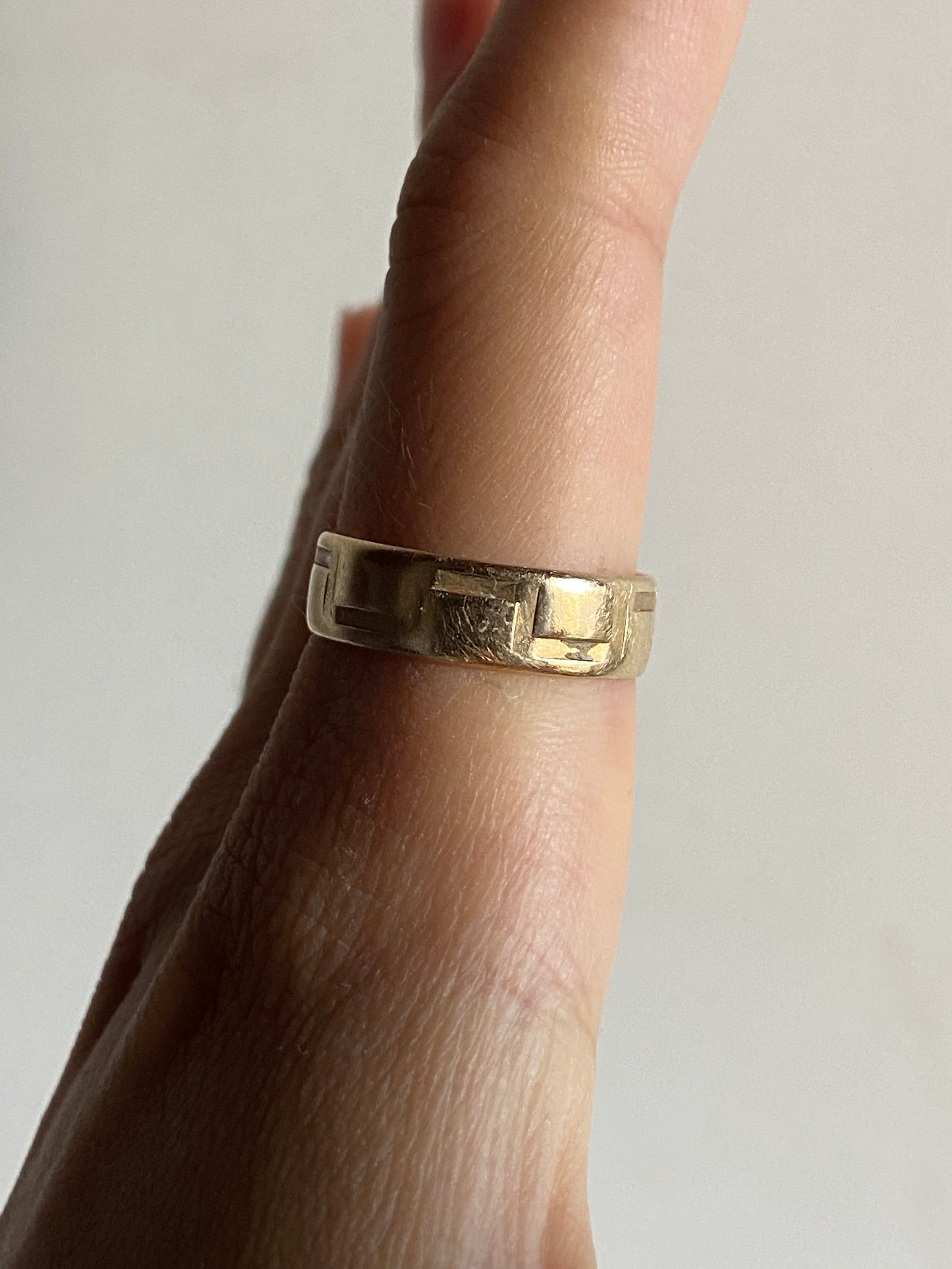 Vintage 1970s 14K solid yellow gold cigar band with an etched geometric pattern.