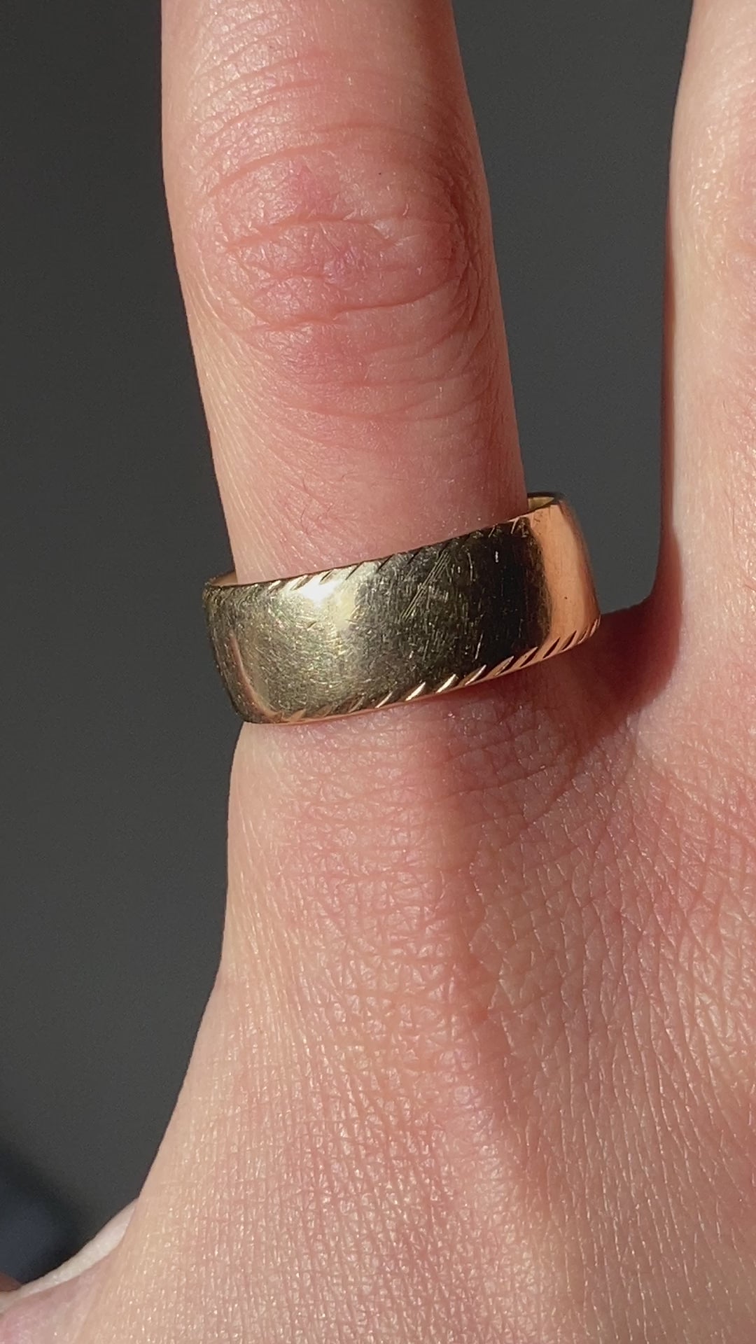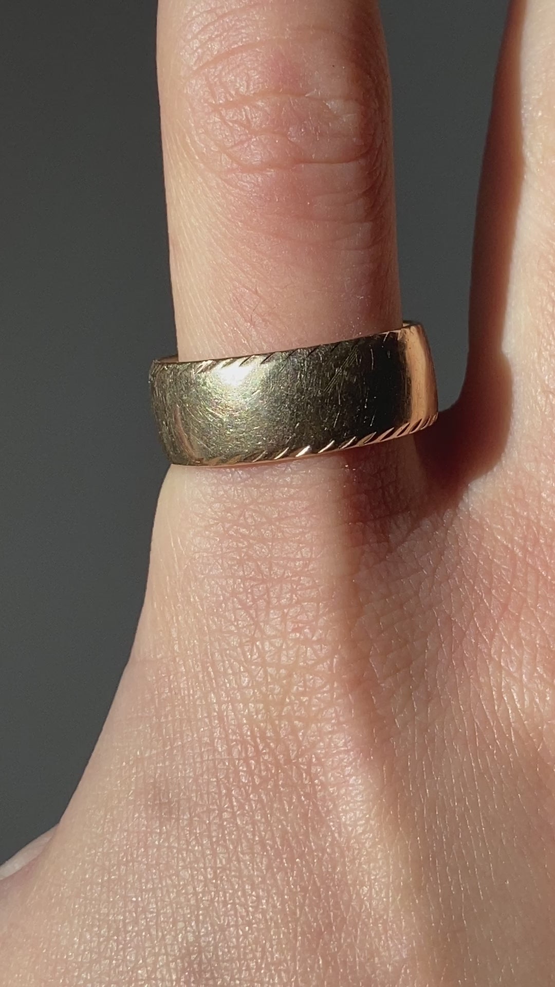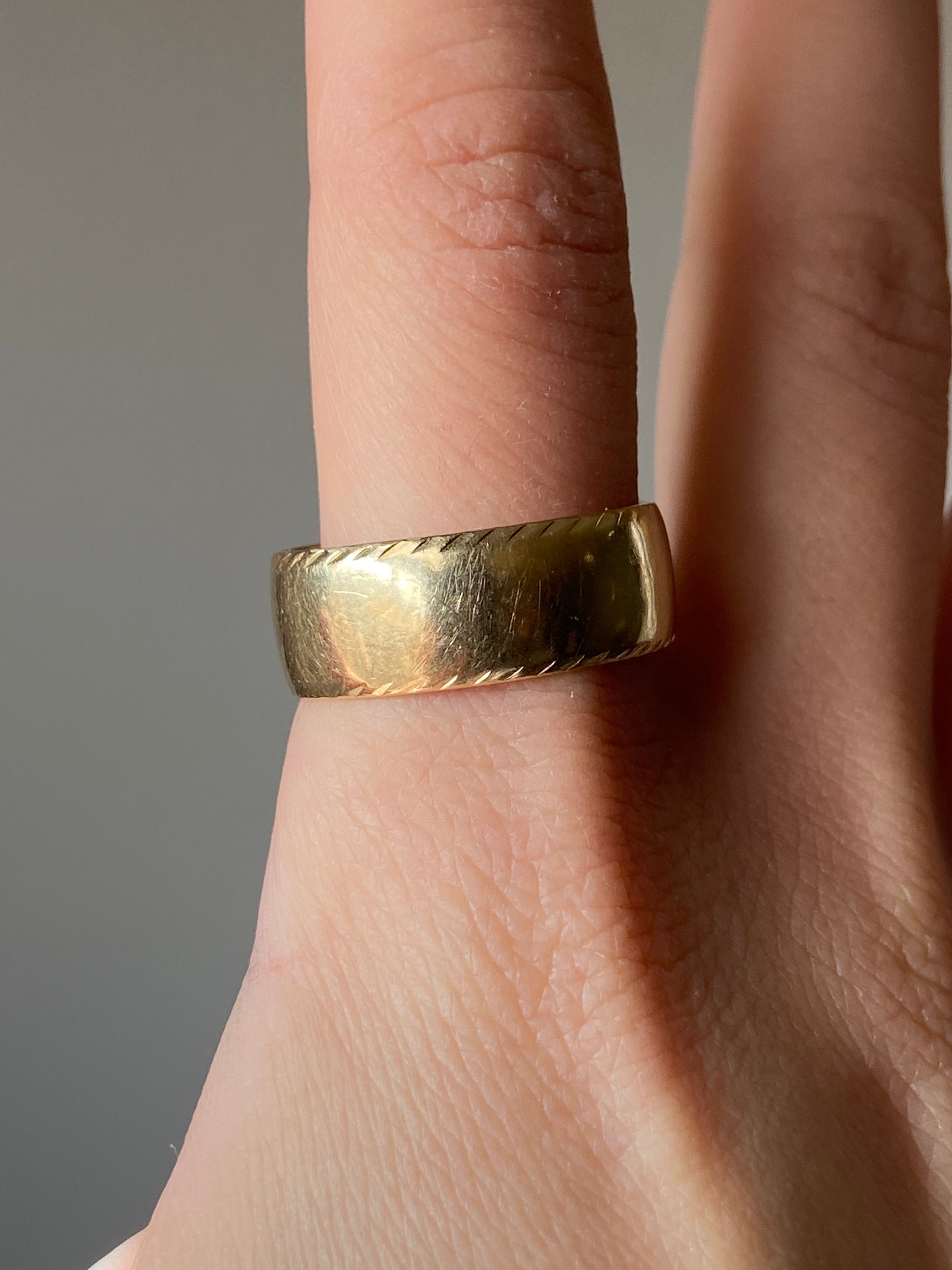 Vintage 14K solid yellow gold cigar band with etchings along the edges.