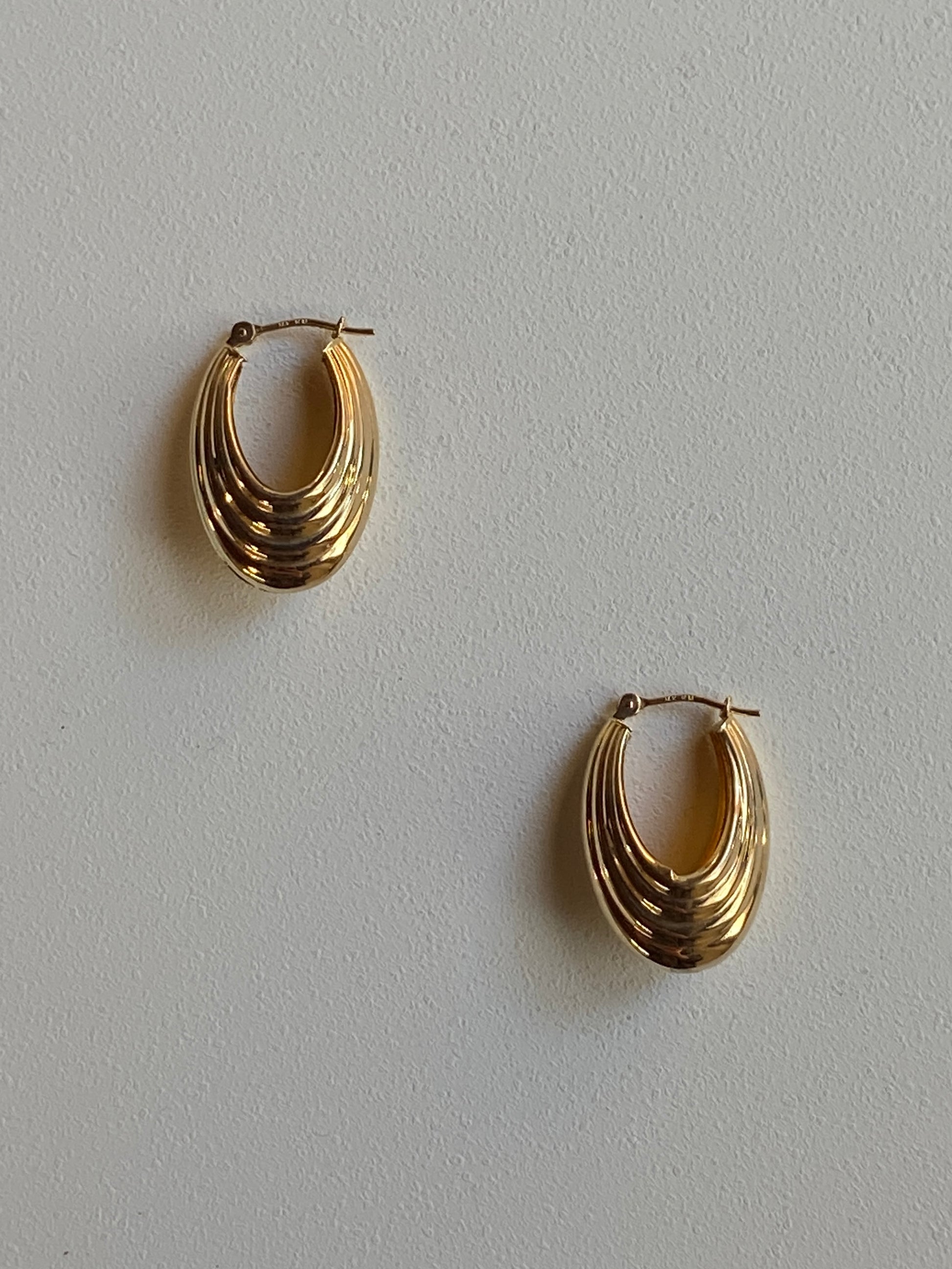 Vintage 14K solid yellow gold oval hoop earrings with ribbing.